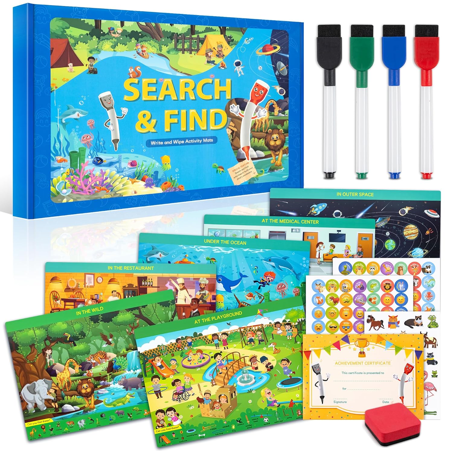 Each double-sided mat features unique scenes like the zoo, space, restaurant, airport, beach, and more. Perfect for developing observation, logic, and vocabulary while having a blast!